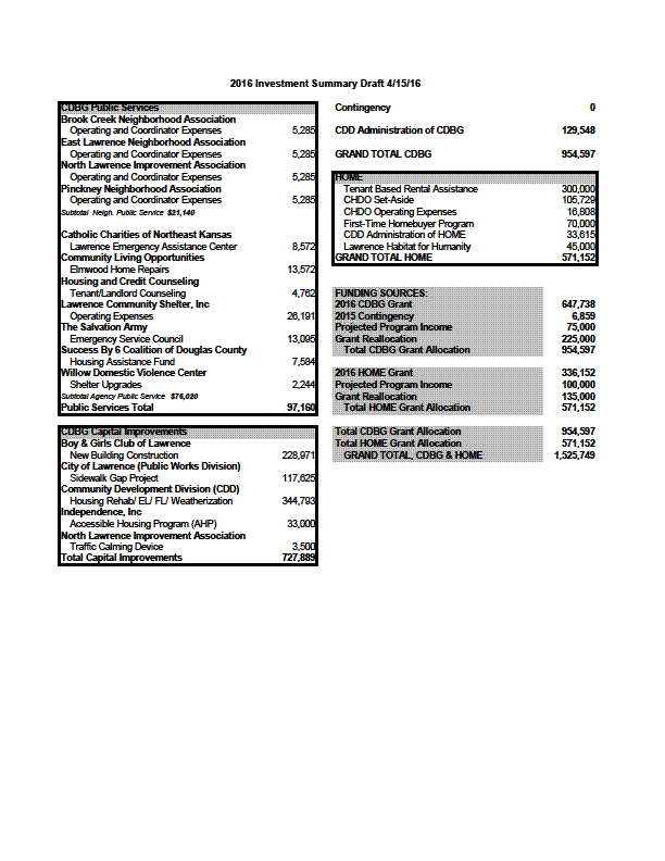 The City Commission will consider adoption of the CDBG/HOME 2016 Action Plan and Investment Summary at its regular meeting Tuesday, May 24, 2016. The Consolidated Plan / Action Plan is required by the Cranston-Gonzalez National Affordable Housing Act of 1990 and is the result of a collaborative process whereby a community establishes a unified vision for community development, which in the case of the City of Lawrence is how federal funds are utilized to meet that vision. The majority of the grantees and projects this year are very similar to years past, with the exception of a large allocation made to the Boys and Girls Club of Lawrence for use with the construction of their teen center.