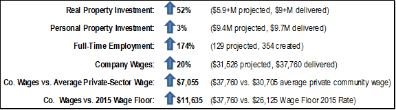 One tax abatement, Prosoco, had expired and was placed fully back on the tax rolls in 2015. At the end of its 10 year abatement period, Prosoco had achieved substantial success, generating 2% more than projected in real property investment and 155% more than projected in personal property investment. The company created 38% more full-time jobs than projected with wages that were 68% higher than projected. At the end of the 10-year incentive period, for every $1 in public sector assistance, $8.47 in Prosoco's private capital investment was realized.