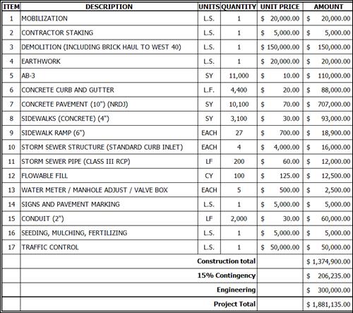 For the City Commission meeting on July 18, 2014, Public Works developed a Preliminary Concept & Cost Estimate which estimated a $3,134,700 budget for the project.