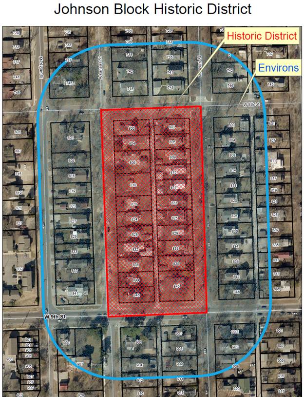 The Johnson Block was initially platted as the Lane Place Addition on March 14, 1871. The block was developed by prominent local businessman Victor Johnson beginning in 1909 and was almost completely developed by August, 1949. The original plat and the development starting in 1909 continued the street grid and lot patterns already established the city. The platted lots and development pattern also continued the typical size of 50’ X 117’ lots in the city. The right-of-way established for both Missouri and Arkansas streets was 80’. All of these patterns exist today.