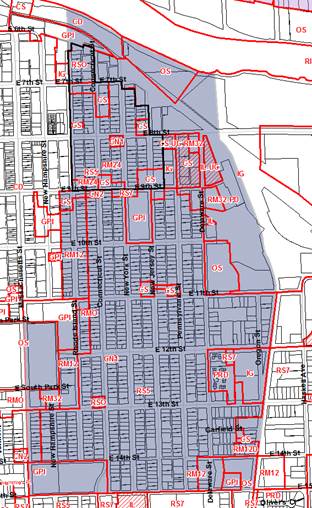 Figure 1b. Zoning in the East Lawrence Neighborhood. Subject area outlined in black. |
