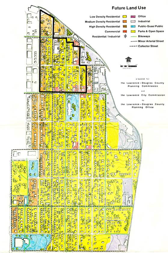The East Lawrence Neighborhood Plan was adopted by the Lawrence-Douglas County Planning Commission on December 19, 1979. The purpose of the document was to provide an official guide to the future development of the neighborhood. The Plan designates most of the East Lawrence Neighborhood as low-density residential (Figure 2). This designation was based on the premise that the existing single-family homes were providing irreplaceable housing for low-income families. Individuals who participated in the development of the Plan expressed concern that a higher density designation would contribute to pressures for redevelopment that could displace the existing residents.