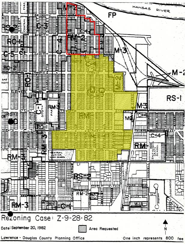 On January 18, 1983 the City Commission approved an ordinance providing for the rezoning of certain lots in the East Lawrence Neighborhood from RM-1, RM-2, M-2 (General Industrial) and C-4 (General Commercial) to RS-2 (Single-Family). The affected area was south of E 9th Street, east of Rhode Island, north of 15th Street, and west of the ATSF Railroad tracks (Figure 3). This Ordinance did not include the subject area north of E 9th Street and as such, the area remained zoned for multi-family uses.