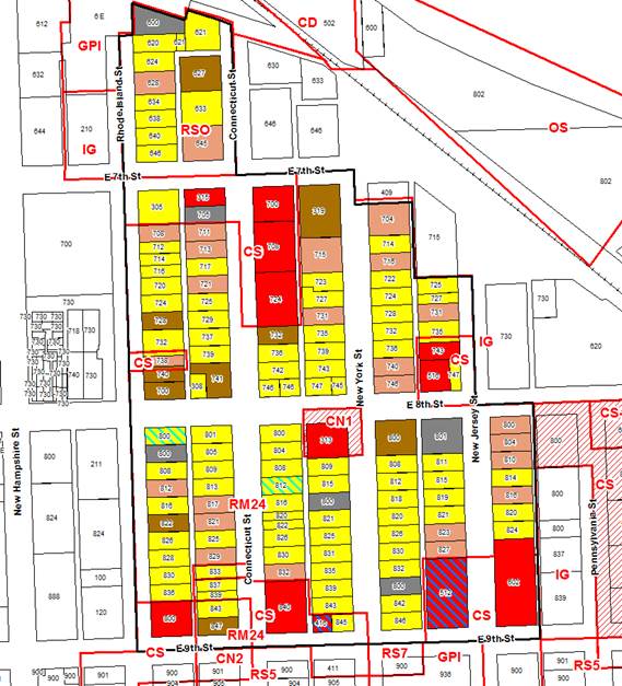 The RSO zoning district is located north of E 7th Street. This area contains one Duplex and one Multi-Dwelling Structure. The rest of the developed lots contain Detached Dwellings. The Duplex and Detached Dwelling uses are permitted uses within this district. Multi-Dwelling Structures are not a permitted use in this zoning district and they comprise 8% of the this RSO District.