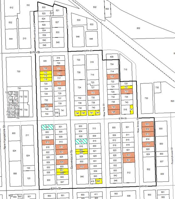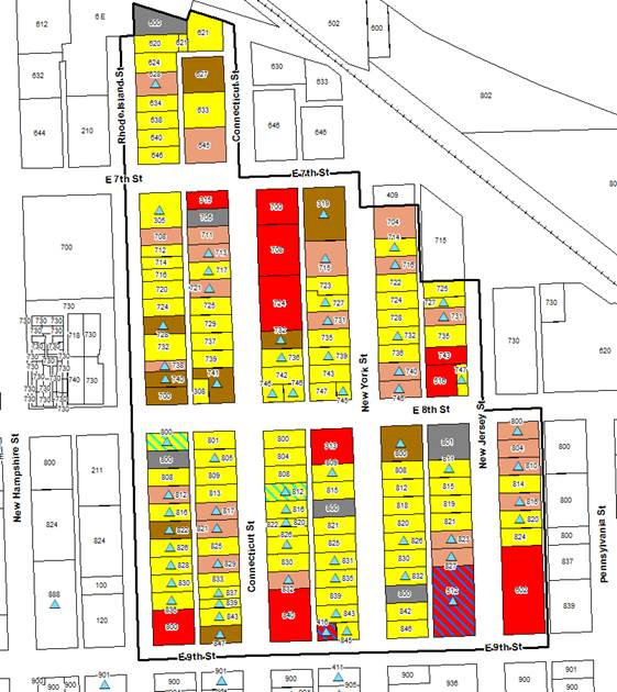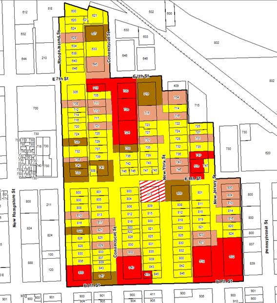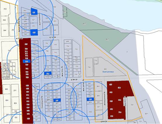 In the East Lawrence neighborhood, north of E 9th Street, there are six properties listed on the Lawrence Register. Properties within 250’ of these listed properties are considered to be within the historic environs. As shown in Figure 7 below, the majority of the properties are located within historic environs. Also, the properties located on Rhode Island Street are in the North Rhode Island Historic District.