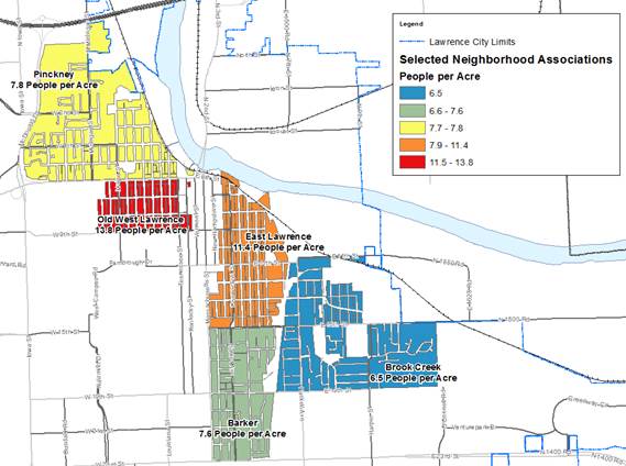 Figure 1. Based on U.S. Census, the map shows the population densities of the East Lawrence and surrounding neighborhoods. |
