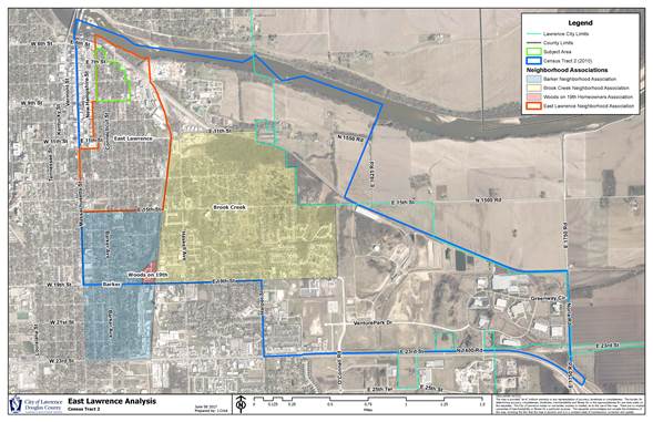 To assess if gentrification has occurred in the East Lawrence neighborhood, staff applied the methodologies found in Governing Magazine (http://www.governing.com/gov-data/gentrification-report-methodology.html). To perform the two-part test, Census Tract 2 of the U.S. Census was used (figure 2). This tract includes the East Lawrence neighborhood, as well as the Brook Creek neighborhood and approximately half of the Barker neighborhood.