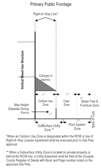 The Public Frontage along a designated Primary Development Zone. Primary Public Frontages are commonly associated with pedestrian-oriented urban commercial and retail areas in Mixed Use settings. They are commonly served by or are Accessible to public transit and may contain medium to high residential densities and Vertical Mixed Use Structures. Primary Public Frontages are designed to accommodate heavy pedestrian traffic, street vendors and sidewalk dining and typically consist of a sidewalk or clear area paved from the back of curb of the Thoroughfare to the Building Frontage or Right-of-way line, reserving space for street furniture. |