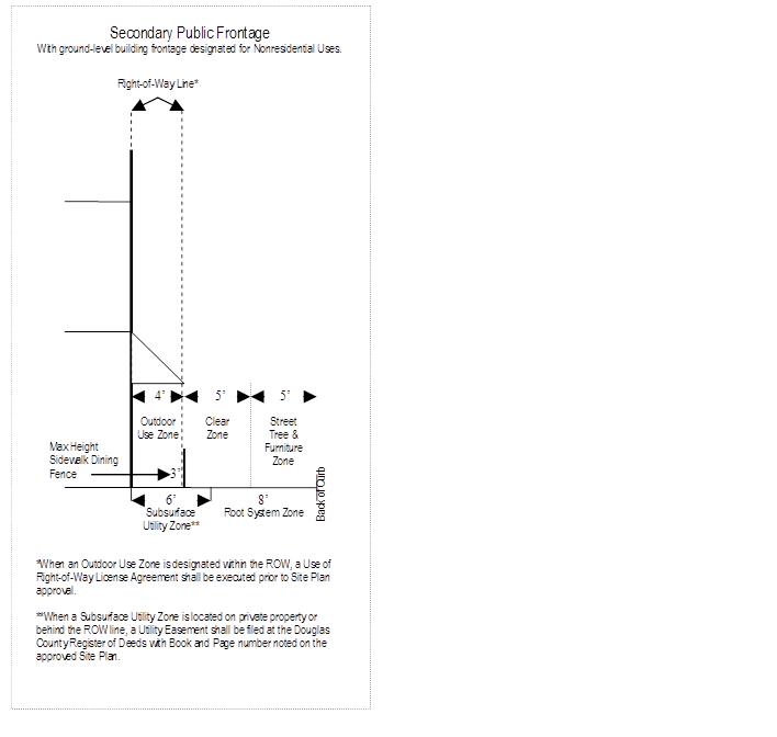 The Public Frontage along a designated Secondary Development Zone. Secondary Public Frontages are commonly associated with pedestrian-oriented Thoroughfares and Mixed Use settings. They are designed to accommodate moderate amounts of pedestrian traffic and typically consist of a sidewalk or clear area adjacent to the Building Frontage or Right-of-way line, reserving space for street furniture, and a landscaped strip with street trees between the back of curb of the Thoroughfare and the sidewalk or clear area. |