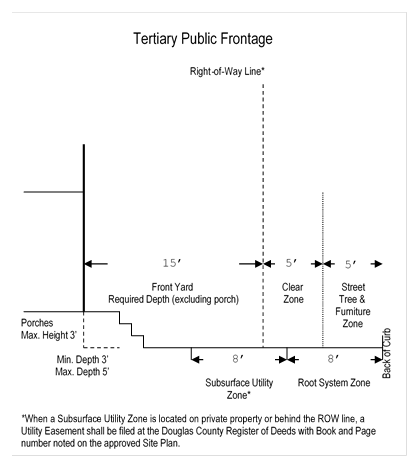 The Public Frontage along a designated Tertiary Development Zone. Tertiary Public Frontages are commonly associated with pedestrian-friendly Thoroughfares in lower intensity mixed residential settings, consisting of a 5 wide sidewalk and street trees. Tertiary Public Frontages are designed to accommodate pedestrians who seek to walk to a nearby destination. |