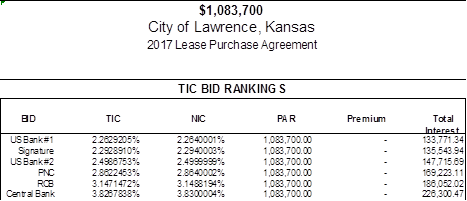 The lowest interest cost proposal was from USBank (Option #1) for an interest rate of 2.27% and total interest cost of $133,771.34 over 10 years. This proposal provides the option for prepayment of the lease in whole after 12 months at 103% of the remaining balance on the lease at the time of prepayment.