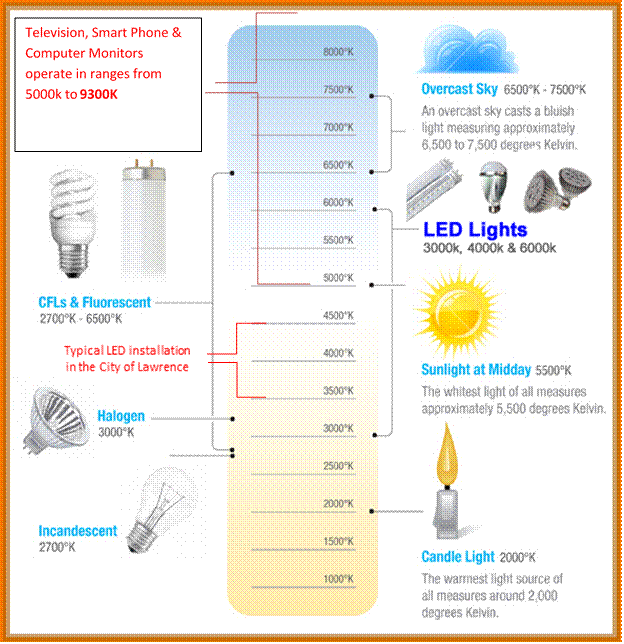 When dealing with roadway lighting the City has used the recommended practices and guidelines provided by Illuminating Engineering Society. Currently the City has been using 4000K. There is no doubt that the LED lighting provides a better light than the previous HPS mercury vapor or metal halide fixtures and use less energy.