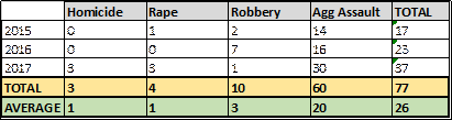 There were a total of 77 violent crimes for 2015 through 2017 with an average of 26 violent crimes. See the below table and chart for the breakdown of the years and violent crimes.