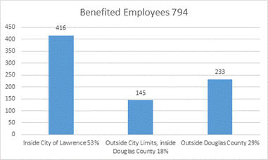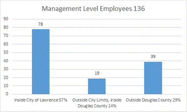Over 70% of employees in any level of breakdown live in Douglas County with the majority also within the City of Lawrence city limits. Below are three charts that illustrate the current residency of city staff. The residence of employees is that recorded in the City’s payroll records effective December 1, 2018.