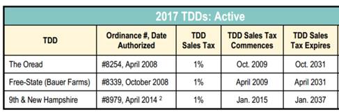 A transportation development district (TDD) adds an additional sales tax to the base sales tax for the purpose of generating revenue to reimburse the project for certain transportation-related expenses associated with the development. In Lawrence, there are three authorized Transportation Development Districts. There is currently a 1-cent TDD sales tax in the following locations: