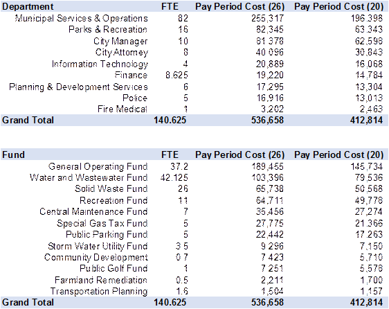 Employee placement. Implementation of the recommended pay structure includes placing employees on the schedule at the minimum rate if their current rate is less. The annualized estimate (including salary and benefit) is $536,658. Implementation at the beginning of the second quarter, on pay date April 5, 2019, lowers the estimate to $412,814.